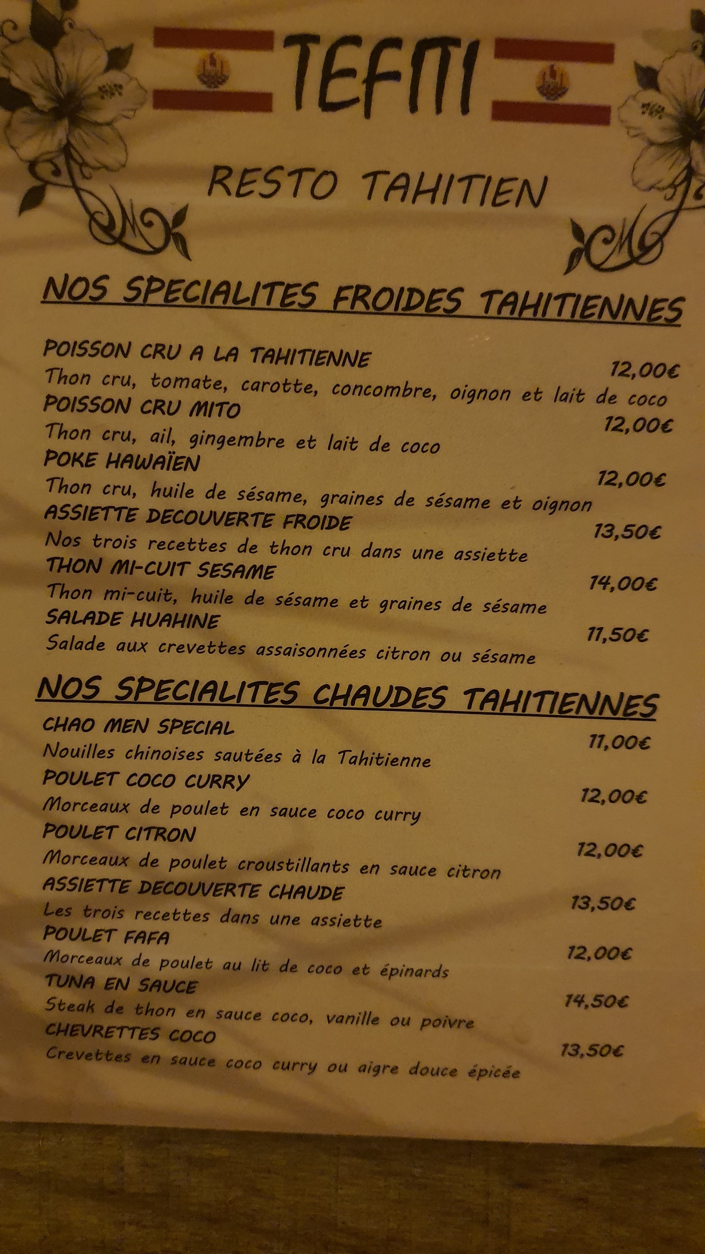 Restaurant au saveur de Tahiti comme si vous y étiez ! Un accueil des plus chaleureux et une cuisine traditionnel savoureuse et servi de manière copieuse... Je recommande le restaurant Tefiti pour une petite ou une grande faim!