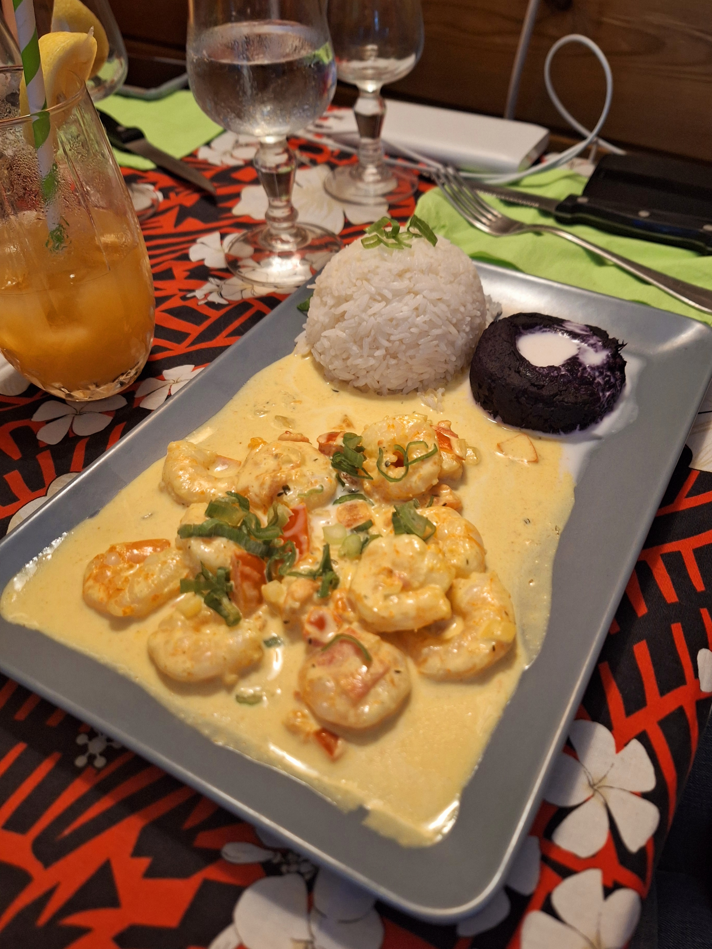 Plat délicieux dans l’ambiance tahitienne. Un repas qui fait voyager à l autre bout du monde. Merci